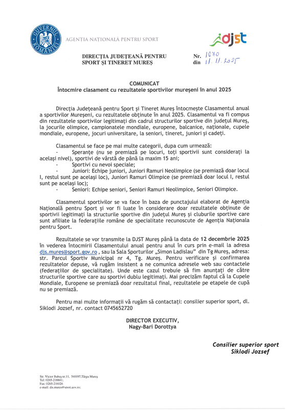Clasamentul anual al Sportivilor Mureșeni 2025